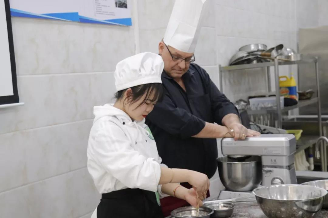 午后,Mr.Stuart一行觀摩烹飪班的面點(diǎn)實(shí)訓(xùn)課,Mr.Stuart興起,決定寓情于教,穿上烹飪專業(yè)圍裙,帶上廚帽,要親自教授18烹飪1的同學(xué)制作巧克力曲奇。EHI 校長親授,這群孩子有福。