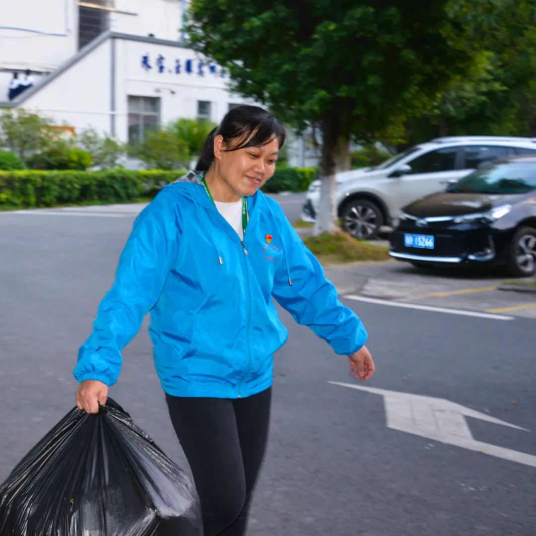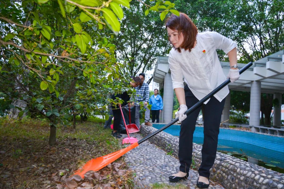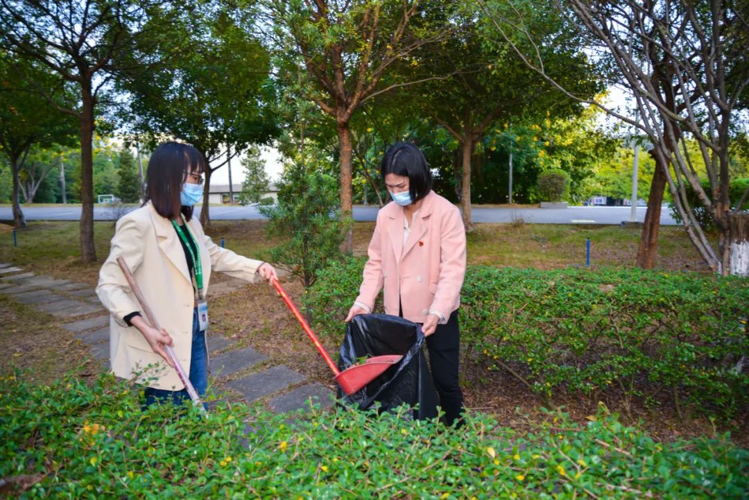 黨員們佩戴黨徽,情緒高漲,熱情飽滿,清理中堅樓小樹林及厚德大道等區域綠化帶中的落葉,不放過任何死角,大家勞動的身影猶如一道亮麗的風景。