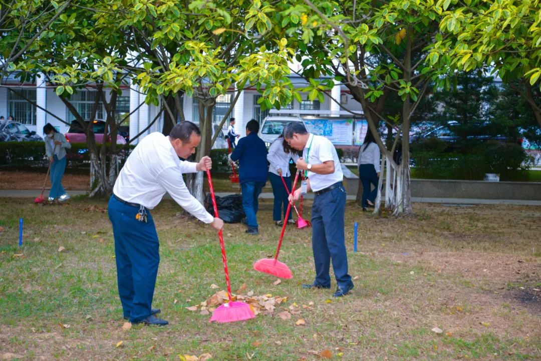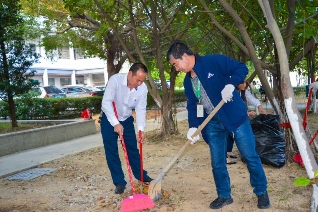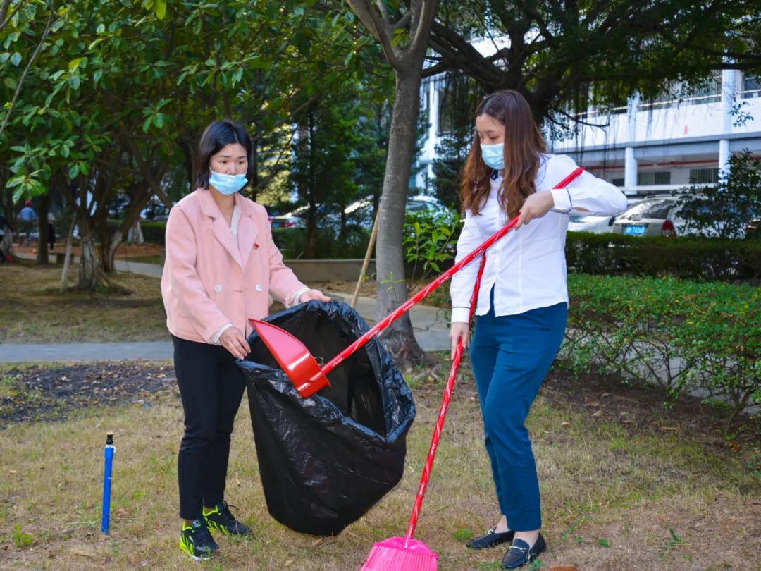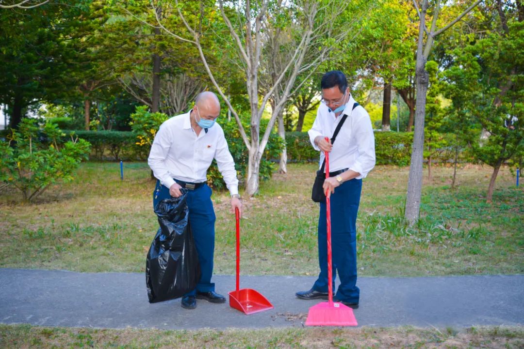 簽約儀式結束后,兩個黨支部全體黨員分成4個小組,聯合開展校園衛生清潔活動。