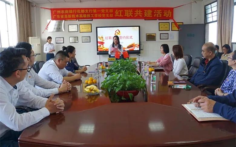 11月23日下午4點,在學校中堅樓會議室,我校黨支部與廣州農商銀行花都支行第一黨支部舉行“紅聯共建”簽約儀式,開展黨建共建活動。學校黨支部書記陳燕清、副書記張娟、高新教育集團董事簡菘波、高新技校校長助理孫建華,廣州農商銀行花都支行黨委書記黃少珊、廣州農商銀行花都支行第一黨支部書記崔莉莉、廣州農商銀行花都支行公司業務三部團隊長鞏軼斐,以及雙方黨支部其他支委委員、黨員代表一起參加了活動。